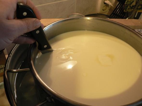1. В некоторых рецептах рекомендуют пастеризовать молоко, но у меня молоко проверенное, поэтому решил не делать этого, а так пастеризуем при температуре 62 градусов в течении получаса — это критично, если домашнее молоко неизвестного происхождения. Нагревать молоко лучше на водяной бане.