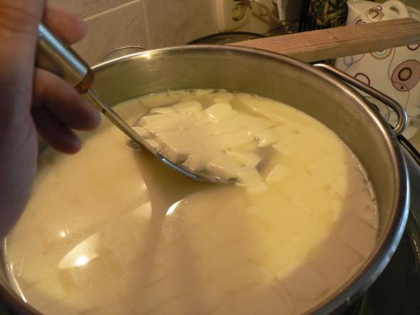 10. Постепенно увеличивая температуру воды до 38 градусов, и поддерживая ее на таком уровне, аккуратно периодически перемешиваем сырную масссу (теперь это уже сырная масса), стараясь не допускать слипания кусочков. Если попадаются большие куски, заодно режем и их. Перемешивать можно ч/з каждые 20 минут.