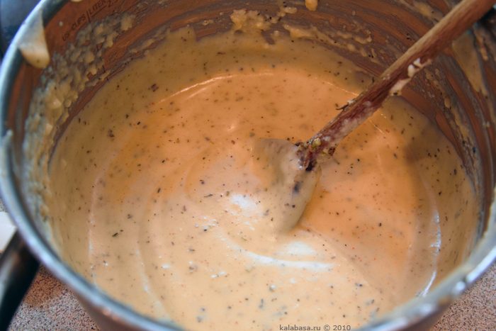 Теперь кастрюлку ставим на плиту, на средний огонь, и, помешивая, ждем, когда творог начнет плавиться. Ага, именно плавиться, кстати, для чего как раз обязательно наличие соды. Минут через 10-15, у вас получится вязкая, тягучая такая масса, в которую нужно будет добавить все специи.