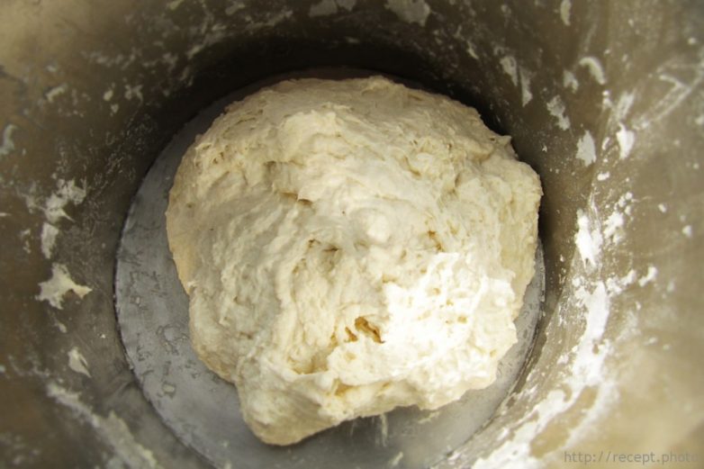 Время прошло и тесто увеличилось в два раза. Оно стало еще более липким и эластичным. Жамк-жамк по стенкам лопаткой, вываливаем на стол