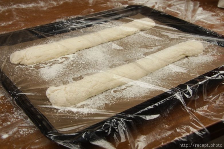 Будущие багеты присыпьте мукой, накройте пленкой и уберите в теплое место на растойку. Примерно на час-полтора