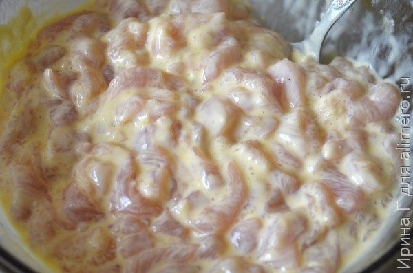 я делаю без муки, но добавляю всё по 3: крахмал, яйца, майонез. Точно так же можно делать со свининой, говядиной, только оставлять промариноваться на несколько часов, а перед подачей пожарить.