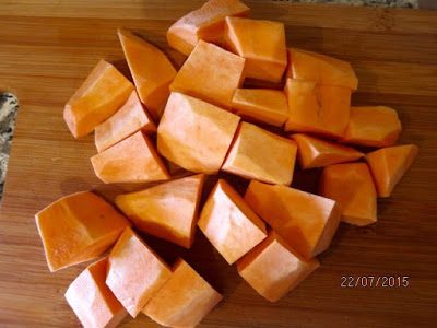 Сладкий картофель чистим и нарезаем крупными кубиками.