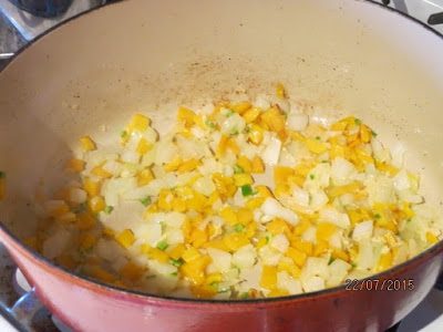 В жаровне или кастрюле с тяжелым дном разогреваем вторую половину растительного масла. На среднем огне готовим лук и сладкий перец со щепоткой соли, часто помешивая, до мягкости, минуты 4.
