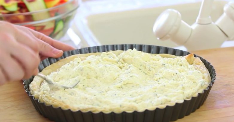 Поместите овощной цветок в средину пирога, а затем раскладывайте, как угодно.