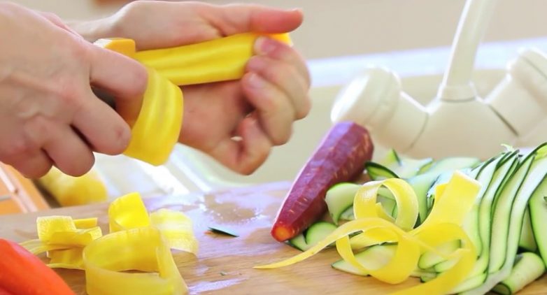 Нарежьте морковь и цукини тонкими полосками. Если перед этим поставить их в микроволновую печь на 1 минуту, тогда будет легче разрезать.