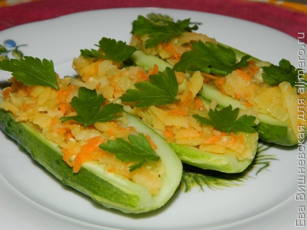 Фаршируем наши огуречные лодочки подготовленными овощами. Сверху украшаем петрушечкой — листиками или рубленной — по желанию. Приятного вам аппетита!