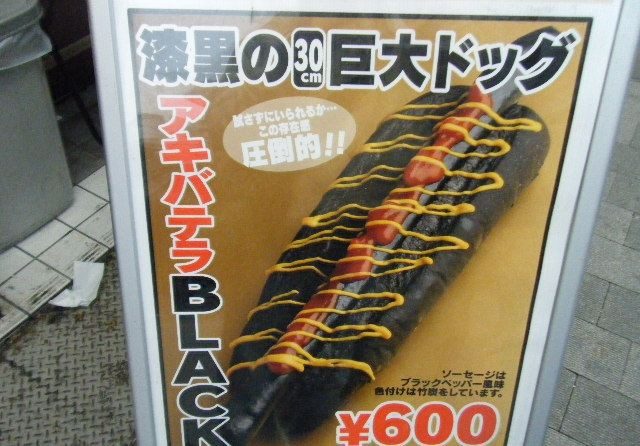 Одна из японских закусочных предлагает своим посетителям отведать этот деликатес, который выглядит так, будто он сгорел дотла и превратился в угли. На самом деле, секрет такого цвета — чернила кальмара, которые пропитывают любой продукт. Продаются такие сосиски в квартале Акихабара, Токио.
