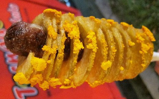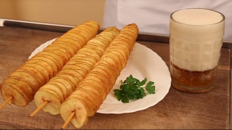 Спиральные чипсы на палочке – это относительно новая интерпретация популярного продукта из картошки, они готовятся из свежей картошки непосредственно на глазах у покупателей, посыпаются солью и приправами, а иногда дополняются жареной сосиской. Очень хорошо подходят к пиву и прохладительным напиткам.