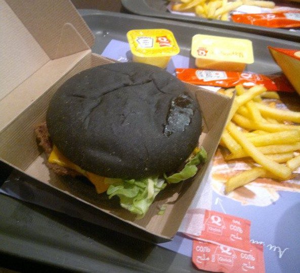 Так один из ресторанов быстрого питания подготовился к премьере очередного фильма «Звездные войны». Согласитесь, что выглядит этот бургер не очень аппетитно. Такое ощущение, что булочки преднамеренно сожгли, но на самом деле они просто покрашены, а между ними есть сыр, помидоры, салат и две говяжьих котлеты.