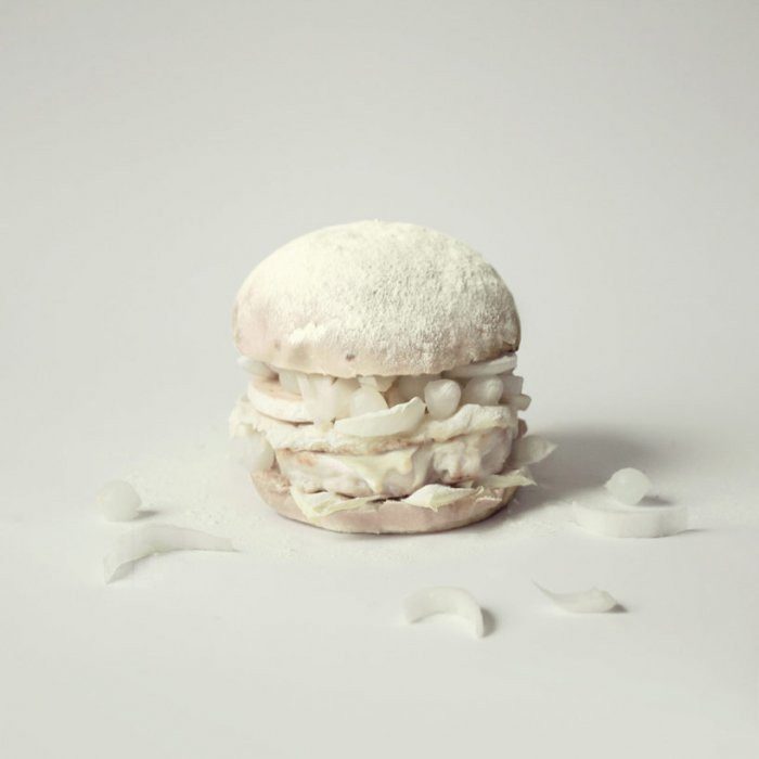 А для тех, кому не нравится черный цвет, существует белый бургер. Согласитесь, что выглядит он намного аппетитнее и, что очень важно, белый бургер не содержит красителей. Все ингредиенты этого «бутерброда» совершенно белые, он состоит из филе курицы, жаренного камамбера, меда, маринованного в уксусе лука, цикория и шампиньонов.