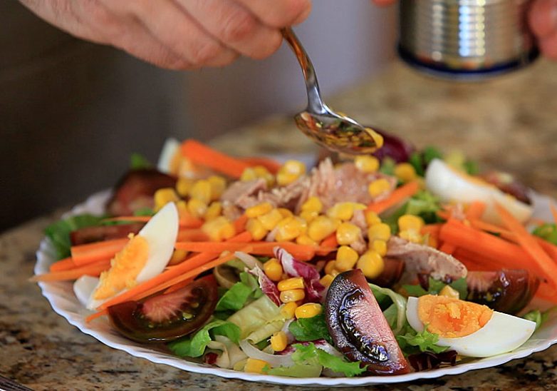 Заправляем соусом салат, добавляем соль и крупномолотый перец — и вуаля!