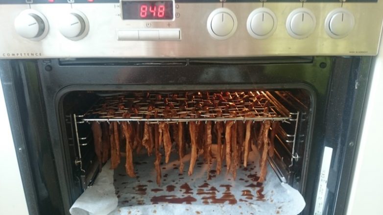 Нарезаем мясо на лоскуты толщиной не более 5 мм и желательно не менее 2 мм. Желательно резать поперек волокон, потом приятно отламывать кусочки. Так же, куски должны быть все примерно одинаковой толщины, иначе какие то куски пересохнут или не досохнут.