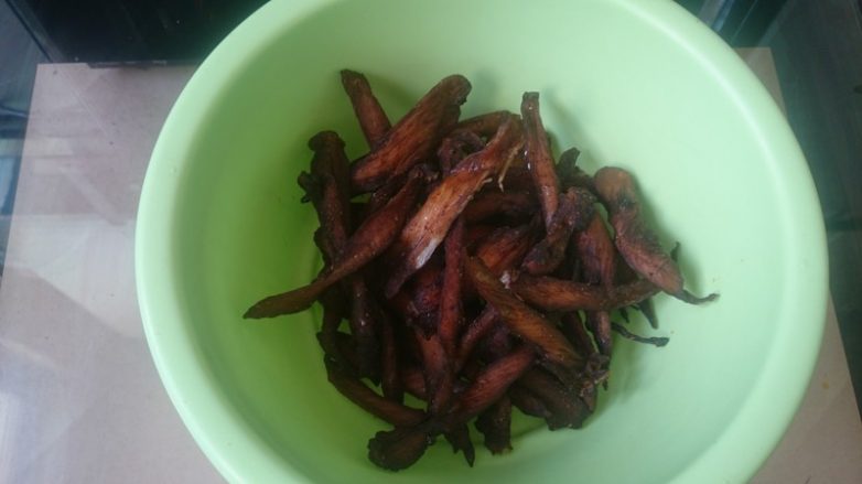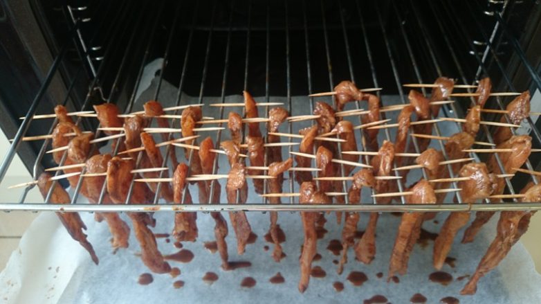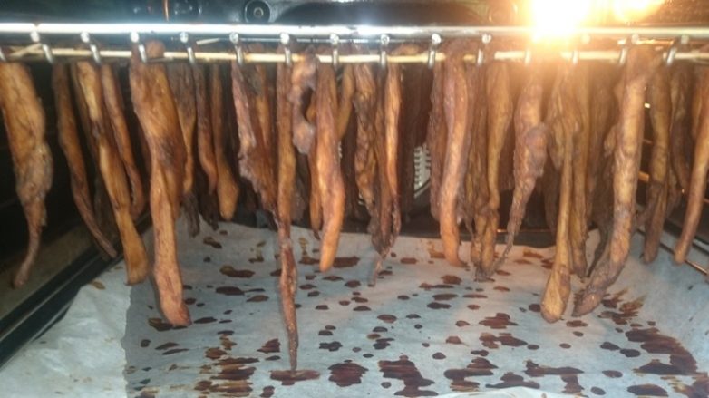 Первой я вывешиваю курятину, так как структура её мяса нежнее, готова она будет раньше. Если кусочек не равномерный, один конец толще, то за толстый конец и вешаю. Сверху теплее а значит сохнуть будет лучше.