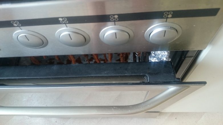 Закрываем духовку, но оставляем 2 см щель, что бы воздух лучше гулял. Я слепил шарик из фольги.