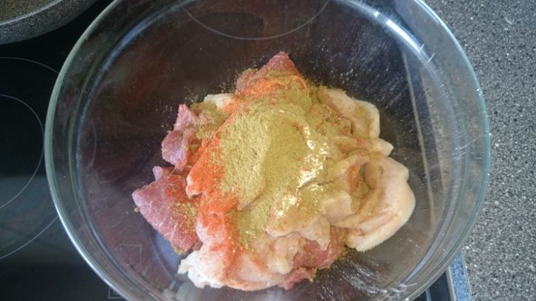 Так же насыпаем перец и соль, по вкусу. Если положить смесь перца чайную ложку и больше, мясо будет острить
