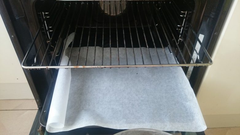 Решетку ставим на самый верх, противень в самый низ и накрываем его фольгой или вощеной бумагой. Сок будет капать и гореть на дне духовки, если не подстелить.