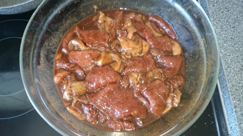 Тщательно перемешиваем, если мясо в соусе не плавает, то можно добавить еще. Уже выглядит аппетитно, хоть так ешь :)