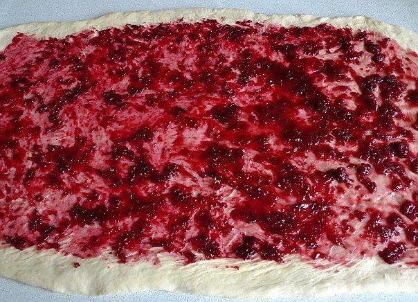 5. Достань тесто из холодильника, переложи на присыпанную мукой рабочую поверхность и раскатай в прямоугольник 60х30 см. По поверхности прямоугольника распредели ровным слоем начинку, отступая 1,5 см от края теста.