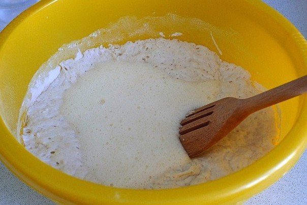 2. Спустя 2 часа влей в опару оставшуюся жидкость, взбитые с сахаром и солью яйца и высыпи оставшуюся муку. После этого, размешивая, постепенно добавляй сливочное масло.