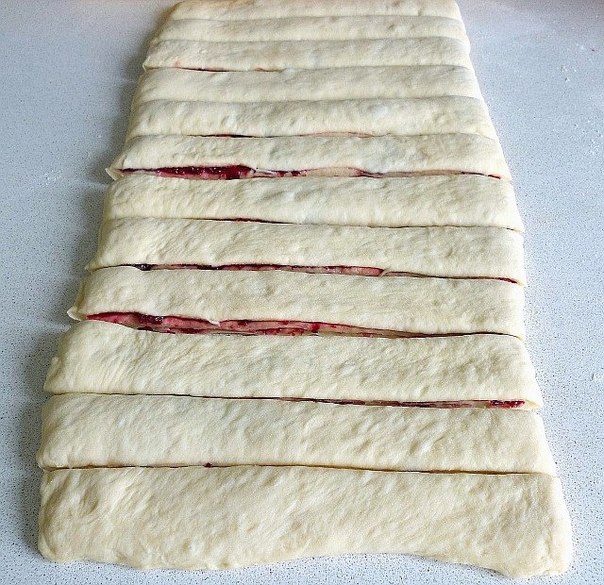 7. Края теста защипли и слегка прокатай рулет скалкой. Разрежь рулет поперек на 12 полосок шириной около 3 см.