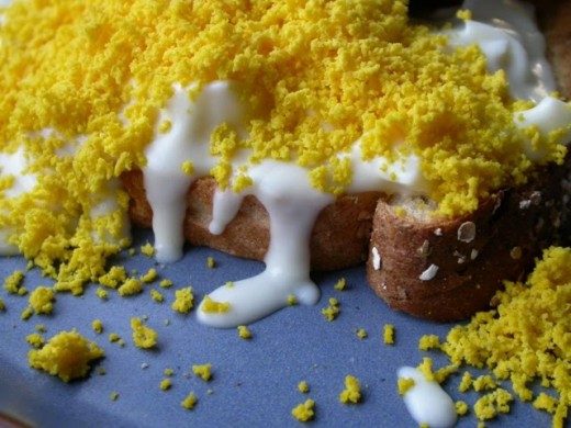 Мелко нарезанный белок размешивается с крем-соусом. После этого готовый соус намазывается на тост, а сверху крошится желток.