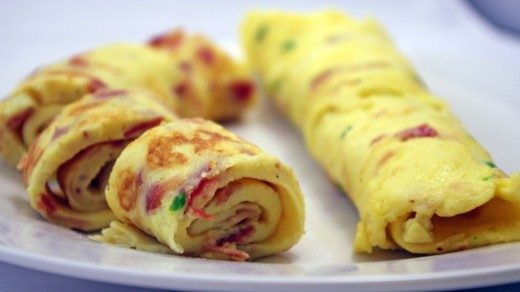 Взбейте яйца, вылейте их на сковородку, смазанную маслом, так, чтобы слой сырых яиц был в толщину около 2 см. Подождите, пока яйца приготовятся с одной стороны, затем переверните омлет, положите сверху всё, что вы хотели бы завернуть в рулетик, например нарезанную ветчину и перец. После того как приготовится вторая сторона омлета, просто скрутите его в рулетик.
