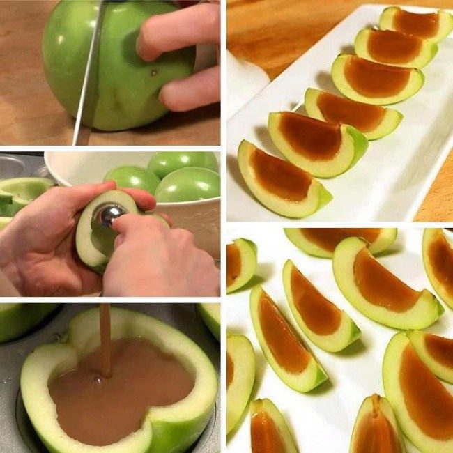 33. Вырежьте у яблока сердцевину, залейте карамелью, поставьте в холодильник