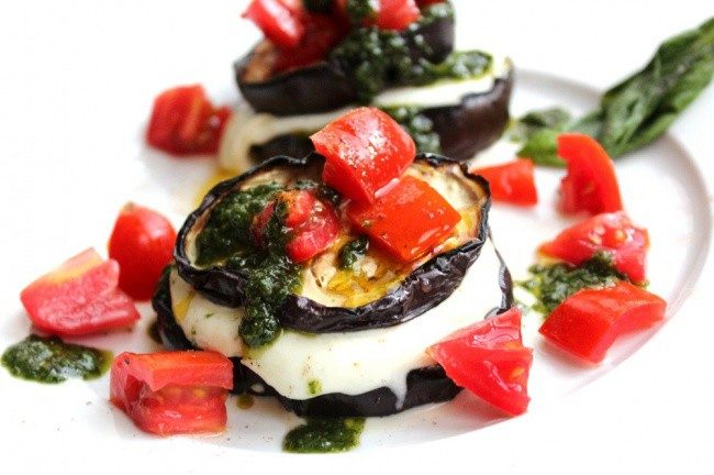 Баклажаны нарезать дисками в примерно в 1 см толщиной, присыпать солью и оставить на 1-2 часа, чтобы овощи дали сок. Нарезать мелко помидоры. Базилик измельчить в блендере до пастообразной массы, заправить солью и маслом (можно также выдавить чеснок). Когда баклажаны готовы, промокнуть их бумажным полотенцем и обжарить до готовности (на сковороде-гриль или обычной). Нагреть духовку до 200 градусов. Нарезать сыр. Обжаренные диски баклажанов выложить на противень, застеленный бумагой для выпечки, смазать их пастой из базилика. На половину дисков выложить кусочки сыра и закрыть вторым баклажаном. Отправить в духовку на пару минут, пока сыр не расплавится. Затем выложить на тарелки, добавить нарезанные помидоры, сбрызнуть оливковым маслом, посолить и поперчить по вкусу.
