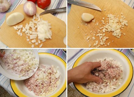 Чистим лук, нарезаем меленькими кубиками. Чеснок тоже раздеваем и давим через чесночницу, а можно и дрiбненько нарiзати. (Потянуло меня на ридну мову). Добавляем лучок с чесноком к фаршу, перчика молотого туда, соли по вкусу и хорошо вымешиваем руками.