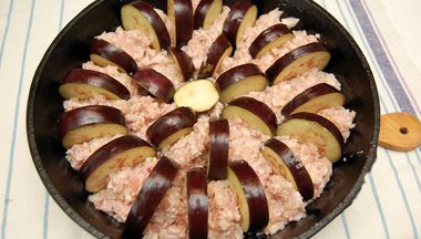 Его нужно слить, там вся горечь. Теперь берем кружочки баклажанов и вертикально ставим их по периметру, а между ними кладем небольшими порциями фарш. Получается вот такая картина: