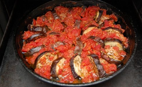 Получаем отличный томатный соус. Заливаем этим соусом баклажаны с фаршем.