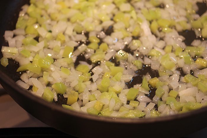 Начинаем с поджаривания мелко порубленных лука и сладкого перца на кукурузном масле.