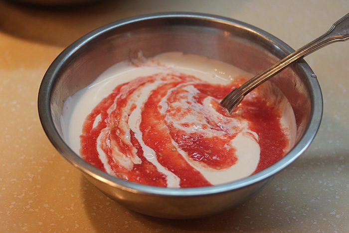 Далее, натираем оранжевый чеддер и подготавливаем соус — смешиваем блендированный помидор со сметаной и куриным бульоном. Для блюд мексиканской кухни, если мы стремимся к аутентичности, я бы не рекомендовал использовать какой-либо другой сыр, по крайней мере из тех, что продаются в России. Что касается соуса, то тут возможны варианты — можно обойтись без томатной составляющей, а можно, наоборот использовать только томатное пюре (с солью, орегано и красным перцем, наример).