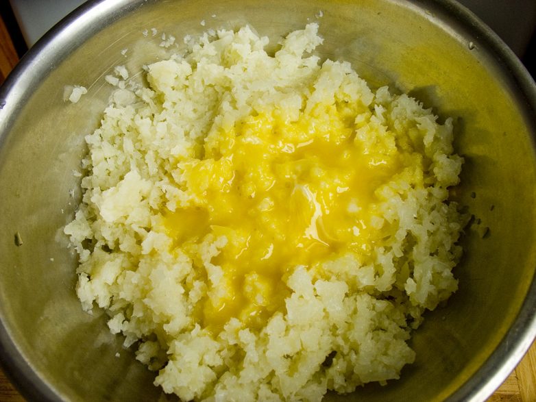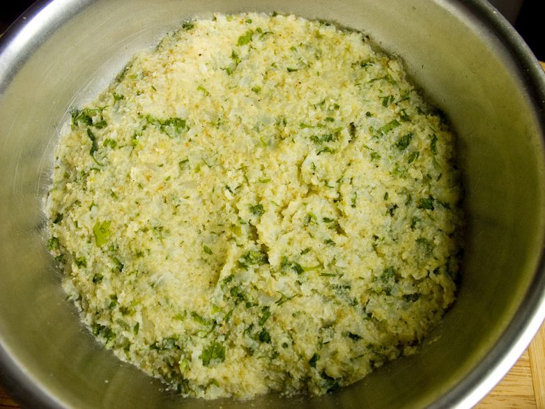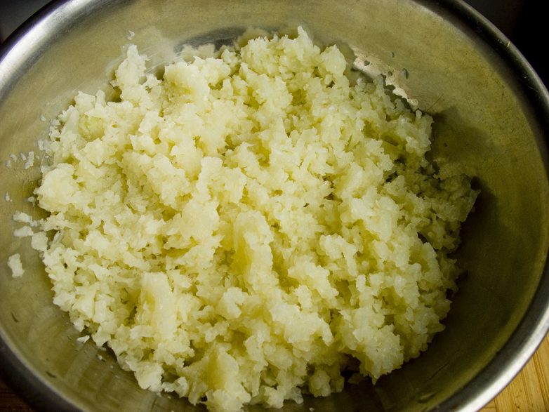 Как правило овощи для крокетов превращают в пюре, но мне не нравится пюре из цветной капусты и я решил просто раздробить кочешки в блендере в импульсном режиме на более-менее крупные кусочки — размером примерно как обычный горох.