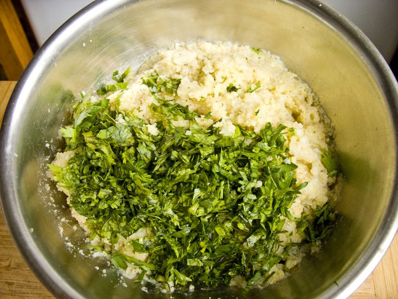 Добавил нарезанную зелень (петрушку и кинзу) и столовую ложку молотых сухарей — «тесто» выглядело немного жидковатым, лепка крокетов представлялась в таком случае сложной, для сгущения «теста» использовал известный кулинарный прием — добавил молотых сухарей.
