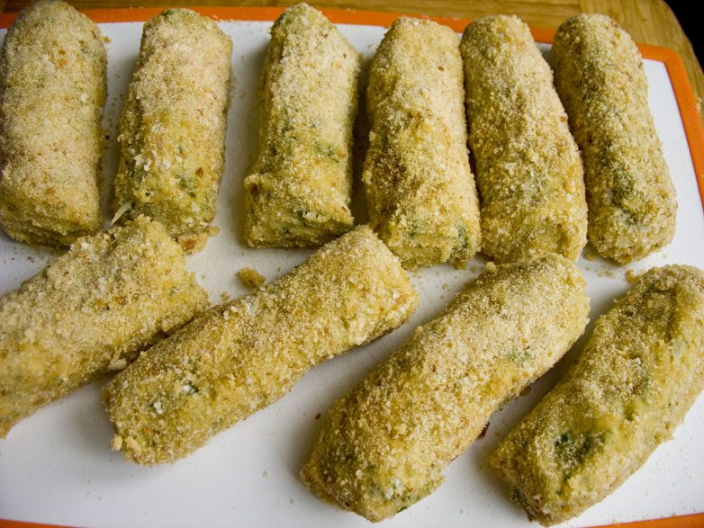 Когда все крокеты готовы, я снова отправляю их на 1 час в холодильник — они окрепнут, панировка лучше прилипнет и не будет осыпаться в кипящее масло и гореть.