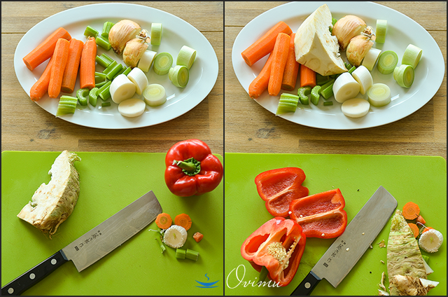 Курицу к бульону подготавливают. Разделывают, солят и оставляют на пару часов. Затем снимают с неё кожу и хорошо промывают под проточной водой. Готовят овощи. Морковку очищают, репчатый лук режут на половинки или четвертинки оставляя кожицу на нем, иногда припекают, чтобы у бульона был красивый золотистый цвет. Нарезают сельдерей, порей, болгарский перец.