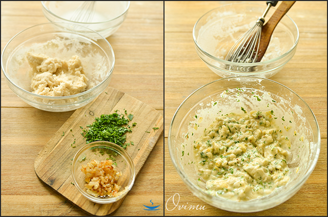 После того как тесто остыло, добавим в него лук, белок, и петрушку. Хорошо вымесим до полужидкого состояния.