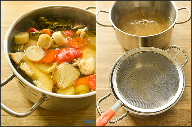 Когда бульон сварился, вытащим из него мясо и овощи. Затем бульон нужно процедить через сито или марлю, как кому удобно будет. Поставим бульон снова на огонь.