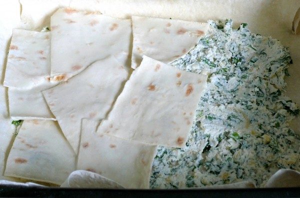 Каждую пластинку нарезанного лаваша окунуть в смесь кефир/яйцо и выложить поверх начинки. Выкладывать внахлест, так, чтобы покрыть всю начинку.