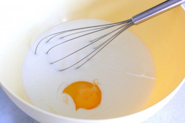 Смешать в миске кефир и яйцо