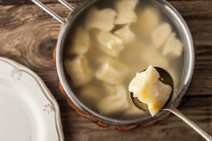 Варим минуты три-четыре. Нам нужно сделать так, чтобы вареники были отварены, однако нужно не перестараться, иначе творог станет «резиновым». Текстура вареника может не быть однородной, визуально можно различить сваренную муку и творог. Крайне рекомендую подавать со сметаной или каймаком. Мне нравится смешивать их с вареньем.