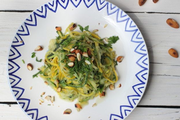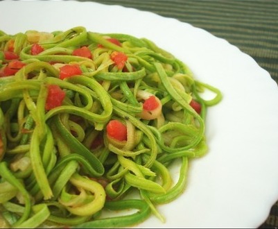 Кабачки (чем моложе, тем лучше) нарезать длинными тонкими полосками — удобнее всего с помощью овощерезки с небольшими зубчиками, посолить немного и оставить на полчаса. (P.S. Подобные овощерезки продаются во многих супермаркетах или в небольших специализированных магазинах посуды и резать ими здорово и другие овощи — морковку и свеклу, например)