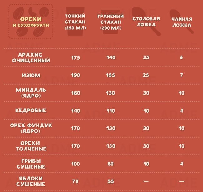 Таблички, из которых можно легко узнать, сколько, например, граммов сахара помещается в стакане.