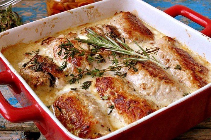 6. Перекладываем кручёники в форму, заливаем сливками. Выпекаем до готовности минут 20-25 в разогретой до 200 градусов духовке.