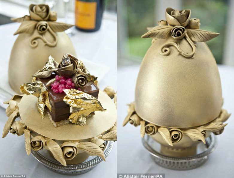 А это угощение – для сладкоежек с более скромным бюджетом. Шоколадный десерт от британского шеф-повара Марка Гиберта. Сладкое блюдо с бельгийским шоколадом украшено двумя бриллиантами и съедобным золотом. Десерт подается в блюде, стилизованном под яйцо, оформление которого было разработано Тео Фаберже, внуком знаменитого ювелира. В 2011 году шоколадное блюдо от Марка Гиберта был признано самым дорогим десертом в Великобритании.
