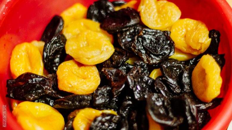 по две части кураги и чернослива и одну часть орех, в моём случае арахис, можно миндаля с фундуком, либо любого другого.