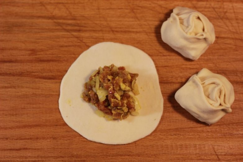 Отщипываем кусок теста как принято говорить «с грецкий орех» и раскатываем из него лепешку. Не слишком тонкую — нужно чтобы она не лопнула в процессе приготовления, и не особо заботясь о форме… Ну скажем так, удобнее будет если она получится слегка продолговатой.