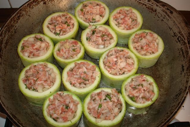Начиняем кабачки и выкладываем в глубокую сковороду